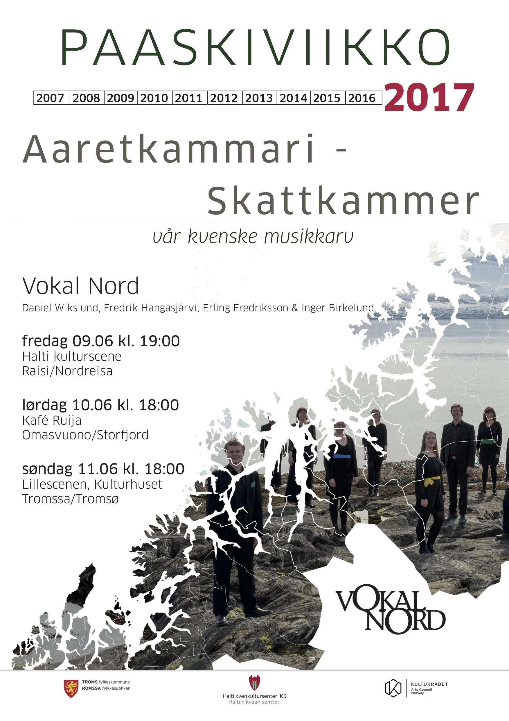 I vår nye konsertturné «Aaretkammari – Skattkammer» dykker vi ned i den kvenske musikktradisjonens skattkammer. Her henter vi fram glemte deler av den immaterielle kulturarven i nord; kvensk språk og kvenske sangskatter. Dette er musikk som tidligere har vært en naturlig og levende del av kulturen i de kvenske områdene i Norge og i Tornedalen.